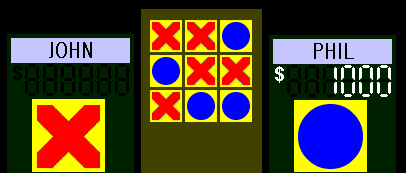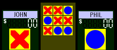 (audience cheers) (John comes from stage left, shakes Ryan and Phil's hands, goes to the X desk) All right, Let me just remind you of the rules of the game. The object is to get 3 stars in a row, either across, up and down, or diagonally. You have to decide if the star is telling the truth or lieing. That's how you get the sqaure. The first game is worth Cy$1,000. John your the Champion you go first. John: Let's start with Jay in the center, please.