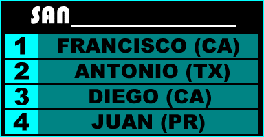 Doug: Robb, we'll start with you. "San << BLANK >>" Robb: The city that was the host of the 2001 Spring American Chemical Society Convention Doug: And that city would be none other than what? . . . . Robb: San Diego