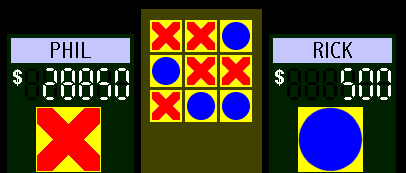 The Ghost of Jay Stewart: from FastTalkers, Chico Alexander... (audience cheers; Chico enters from stage left) from BattleBlocks, Jason Antoniewicz... (audience cheers; Jason enters from stage left) from VBS MarketWatch, Dana Epstein... (audience cheers; Dana enters from stage left) the giraffe boy, Charlie Pevey... (audience cheers; Charlie enters from stage left) from Net Price is Right, Jay Lewis... (audience cheers; Jay enters from stage left) from Net Cross Wits, Mark Sinsabaugh... (audience cheers; Mark enters from stage left) $250,000 "Who Wants To Be A Millionaire" winner, Matt Marcotte... (audience cheers; Matt enters from stage left) and, from The New Net Bullseye, Mike Klauss... (audience cheers; Mike enters from stage left) Ryan: I hope you all had a good holiday season, stars. Now here are our players. First our challenger with Cy$500, playing the circles, Rick Brown. (audience claps; Rick enters from stage left and takes is seat at the circle podium.) And now, our Champion with Cy$28,850, playing the X's, Phil Levine! (audience claps; Rick enters from stage left and takes is seat at the X podium.) Ok, I'm sure you all know how to play. So, let's get started.