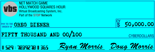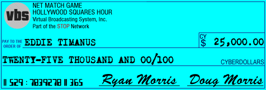 Ryan: I'll be back with you in a moment. Eddie, for playing such a great game, here is this check for Cy$25,000! (Cheers)