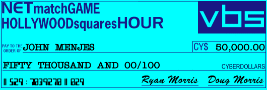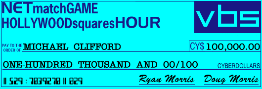 (audience cheers) Ryan: Michael, you won Cy$18,750 we add that to the CY$66,000 you've all ready won plus the Cy$50,000 you one in the Secret Square Game, plus this check for Cy$100,000... Ryan: That makes your final total... Cy$234,750! (audience cheers) Ryan: Now, go see Doug for your chance at Cy$100,000 more! (audience applause; MG-HSH music plays)