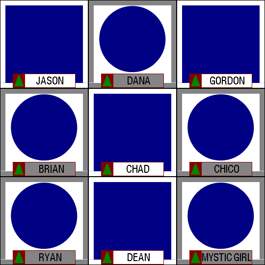(Ryan and Gio are sitting at the HS Podiums) Ryan: Welcome back everyone to the final episode of The Net Match Game-Hollywood Squares Hour. Before we continue I just want to say thank you to everyone who help make this game possible. It has been an absolute blast hosting this show. All right, Let's get going, we have our winner from Match Game, Gio Montagnino. He won Cy$2,500. And, let's bring out our returning champion, so far she has won Cy$10,000. Here she is, Cassie Hikari. (audience cheers as Cassie walks out. She shakes Gio's hand and Ryan's hand) All right, this is a special episode so we've got special rules. Game 1 is worth Cy$10,000 and each square pays Cy$1,000. Plus, we will have a Secret Square in every game worth Cy$50,000!